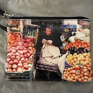 Made in NYC, this little leather wristlet is eclectic and fun! Sows a woman knitting in front of a bodega on both sides.