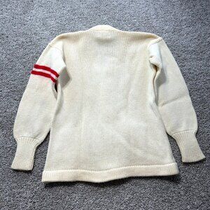 This vintage cardigan, made by Knitting Masters for Princeton, is crafted from 100% wool. A cream knit base, red sleeve stripes, and a button-up front complete its classic design.