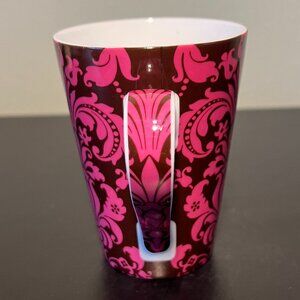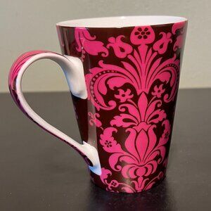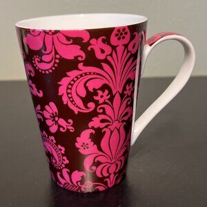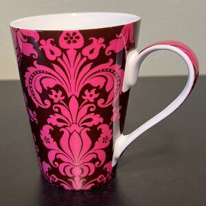 Exquisite Damask floral motif pattern porcelain mug by Könitz in Germany. Stunning intricate floral scroll wallpaper pattern in mauve pink against a dark brown background. wraps around the exterior and extends over the stylish handle. White interior. Measures 4.75” tall with a 3.5” diameter; 5” across including handle. Holds 12 fluid oz. Imported from Germany.