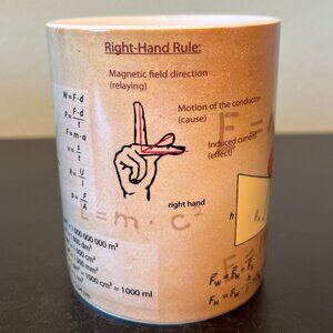 Does coffee make you smarter? It will if you drink it out of this unique physics knowledge porcelain mug with a wraparound design featuring fundamental physics formulas. Learn about electron flow with the help of the well-known three-finger rule (UVW rule), reflection of light, unit conversions, physics formulary, and efficiencies of the inclined plane. Measures 3.5” tall with a 3.5” diameter. Holds 16 fluid oz. From Könitz in Germany. . Made in Thailand.