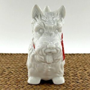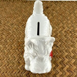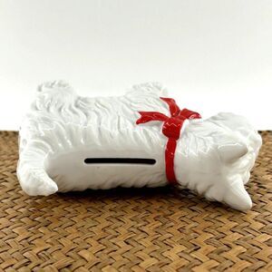 Knobler West Highland White Scottish Terrier Piggy Bank. 6" L x 5" H x 2 1/2" W. Preowned, New Condition, no chips, cracks, crazing, stains or repairs. Charming collectable piggy bank