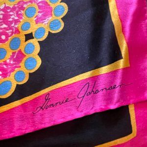 Authentic, vintage Ginnie Johansen 100% silk scarf from the late 1980's featuring hand rolled edges and a vibrant pink, green, blue, orange, and black heart and spade pattern. Very bold colors, large size, and in excellent condition without flaws. Measures 35" x 35.5"