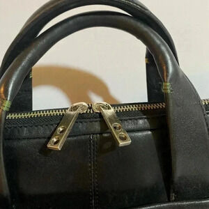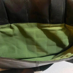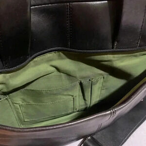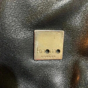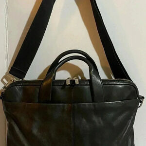 Knomo unisex black leather messenger laptop briefcase bag 3 compartment 2 pockets 2 pin slots 1 card slots at interior wall zip closure at top fabric lining logo at front lining have some stains exterior minor scratches strap have some cracks hight 12” width 16” depth 1.5” strap drop 3” shoulder strap 27” adjustable The dimensions are based on approximately measurements before placing an order please check take a moment to view all photos using feature for a closer look