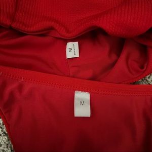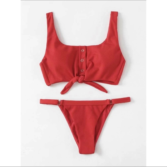 Ribbed bikini with a tie front detail and high cut bottoms. Removable pads in top. Adjustable bottoms. Both sized M. Worn once.