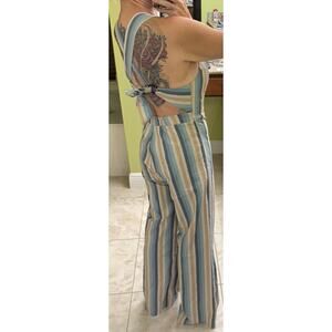 Knot Sisters Lana Jumpsuit linen blend small natural blue stripe zipper side closure $132 retail This Knot Sisters Lana Jumpsuit is a stylish and comfortable addition to your wardrobe!