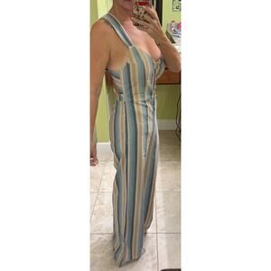 Knot Sisters Lana Jumpsuit linen blend small natural blue stripe zipper side closure $132 retail This Knot Sisters Lana Jumpsuit is a stylish and comfortable addition to your wardrobe!