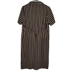 Knot Sisters Striped Midi Dress from Anthropologie! This dress is the ultimate cool and comfy combo, with a trendy black-gold striped pattern that's guaranteed to turn heads. The tie waist cinches in at all the right places for a flattering fit, and the button-down front adds a touch of sass.