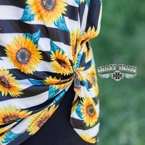 Super cute sunflower and stripe print top with a permanent knot sewn in. Very generously sized. Size down for a more fitted, but still flowy look.