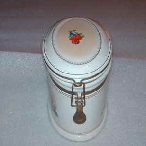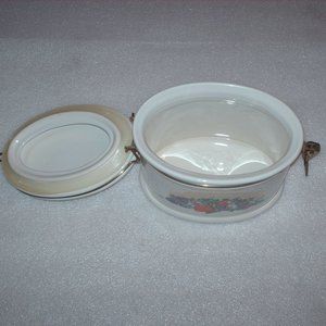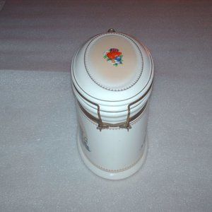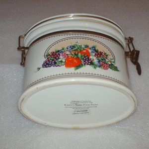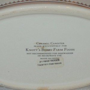 Knotts Berry Farm oval ceramic advertising canister with Hinged Lid. Approximately 8 1/2" long, including hinge by 5 1/8" wide and 7" tall. Lovely decoration with gold trimming. Pre-owned and in wonderful condition, inside and out.