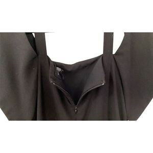This black pantsuit can be worn casually or dress it up Cold shoulder as shown. I couldn’t find a tag size so I’ve guessed it large, please go by these measurements: 17” X 51.5” from shoulder X 22” inseam. I think they call the material crape. Photos have been lightened to show details. It’s really well made.