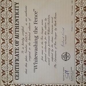 This plate was never displayed and is in excellent condition with no chips or cracks. It's still in the original box with all paperwork. The box is aged from storage and has damage, the sides of the Certificate of Authenticity are yellow from age and the top right corner is torn, see pictures.