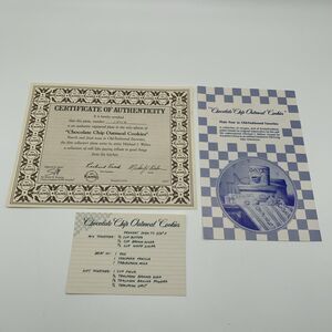 The plate measures about 8.5" in diameter. Included is the original storage box, which has some condition issues due to age and storage..it has yellowed and has a couple of small holes. Also included is the original COA, original 2-sided description of this plate and original Chocolate Chip Oatmeal Cookies recipe card. The plate is in very good pre-owned condition, no chips or cracks.