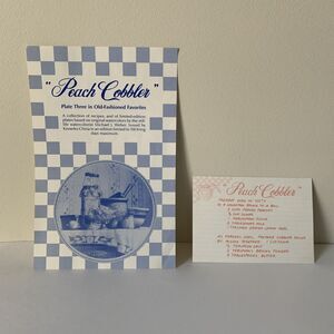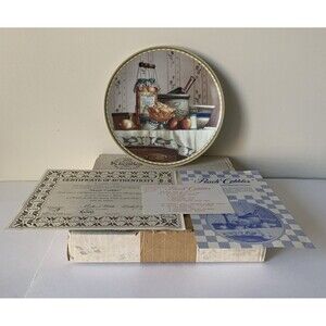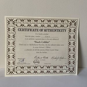 The plate measures about 8.5" in diameter. Included is the original storage box, which has some condition issues due to age and storage..it has yellowed and has old sticker remnant. Also included is the original COA, original 2-sided description of this plate and original Peach Cobbler recipe card. Some of the papers have yellowed a bit over time. Some of the writing and yellow coloring on the back of the plate has worn off I some areas. There are no chips or cracks.