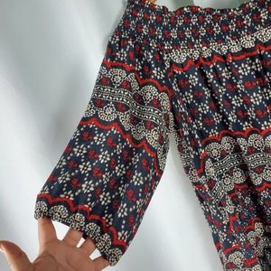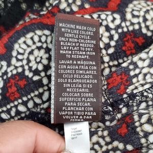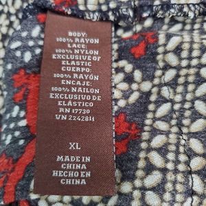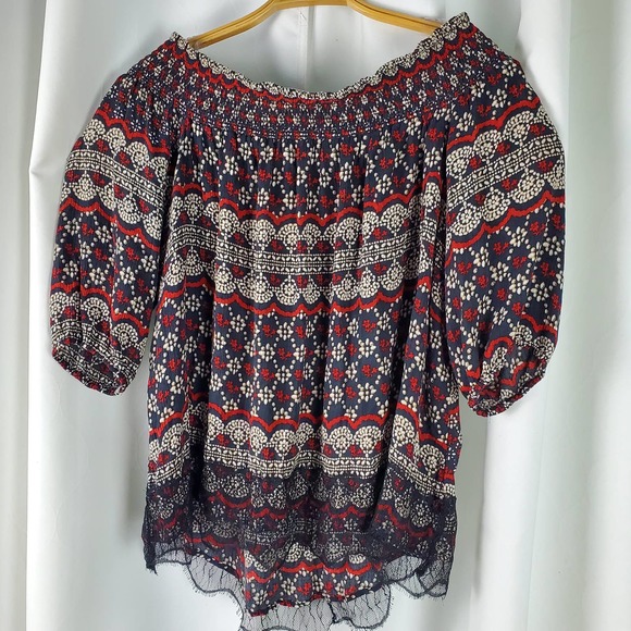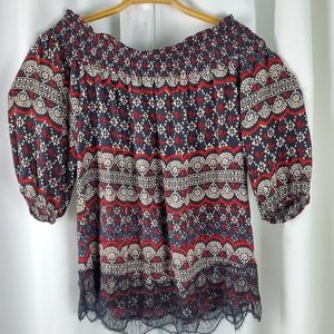 Knox Rose Art deco Blouse Size XL, elastic on sleeve and chest hem, off shoulder, it has a lace on the bottom of the blouse and it has a repair in the back part of the lace see picture 4. Color black, red and beige.