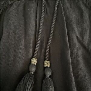 Elevate your wardrobe with this stunning Knox Rose black boho top. The high/low hemline, tie neckline, and 3/4 sleeves make this blouse perfect for any occasion, whether it's a casual day out or a party/cocktail event. The V-neckline adds a touch of femininity, while the embroidered hemline, ruffle, tasseled beaded tie, and eyelet upper back/shoulders accents provide a unique and stylish look.