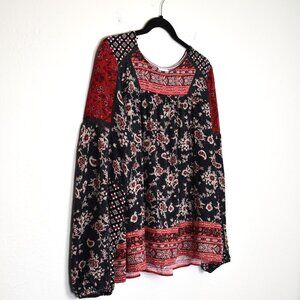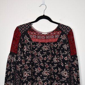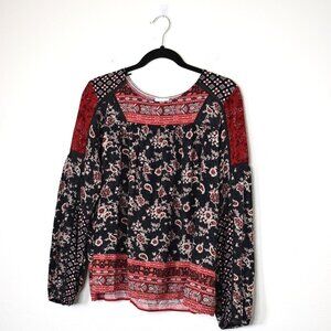 Stylish floral blouse with intricate patterns. Features long sleeves and a round neckline. Perfect for casual wear.