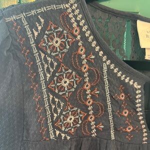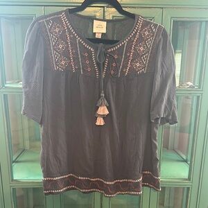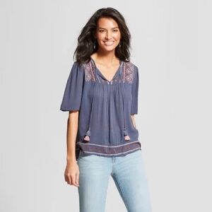 Elegant navy blouse with intricate embroidery. Features tassel accents and relaxed fit. Ideal for casual outings.