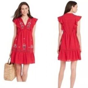Charming red mini dress with floral embroidery. Features ruffled sleeves and a tiered skirt. Perfect for casual outings. Description: