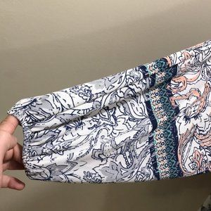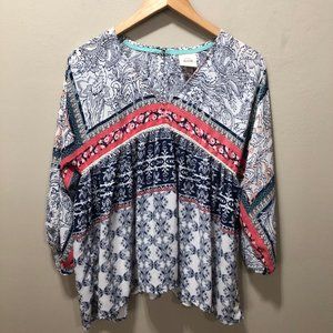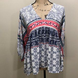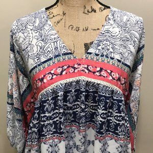 Border print boho peasant blouse. V-neck. Wide sleeves. Elastic cuffs. Asymmetrical hem. Crochet detail along waist.