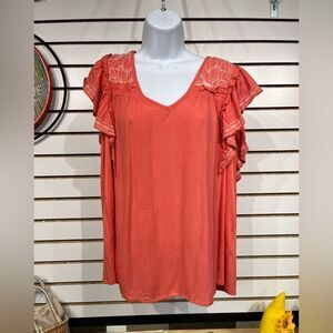 Stylish coral blouse. Features ruffle sleeves and embroidered details. Perfect for casual wear. washed and tried but a bit smaller in length so trying to reposh