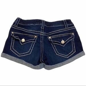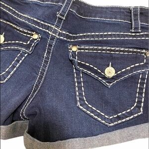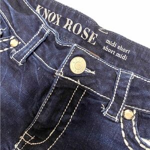 These have been worn once or twice. Beautiful colored denim midi shorts. Have a few jewel embellishments on the back and front.