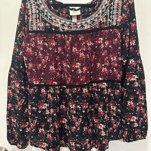 In great condition top with rose print, round embroidery neckline. Long sleeves with cuff elastic. Bohemian lightweight, machine wash.