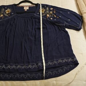 Charming deep blue blouse with floral embroidery. Features short sleeves and a relaxed fit. Ideal for casual elegance.