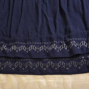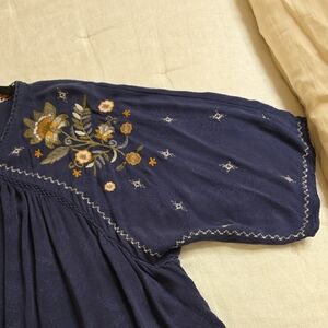 Charming deep blue blouse with floral embroidery. Features short sleeves and a relaxed fit. Ideal for casual elegance.