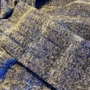 Gorgeous blue and gray patterned tunic-length long sleeve sweater. Has a hint of metalic threading throughout for that extra bling factor. Looks great with skinny pants or jeans. This sweater will take you through fall, winter, and spring. It's even great on chilly summer nights. The asymetrical hemline gives the sweater even more visual interest. The super soft blend of fabrics feels comfy against your skin.