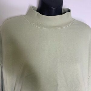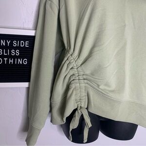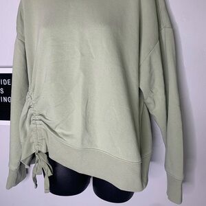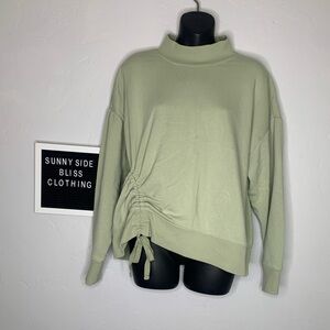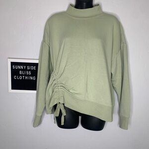 This is a light green pull over sweater with a mock neck and an ajustable ruched detailing on the side. It’s a size large in great pre owned condition no stains or flaws.