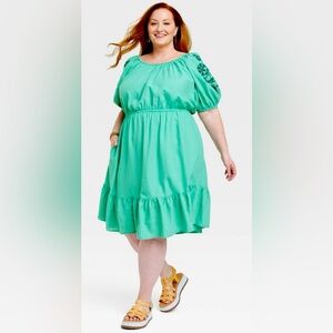 NWT Knox Rose boho inspired embroidered dress size 3x. This dress is full of boho charm! The waist has an elastic band built in for optimal stretch and the sleeves are short sleeved balloon sleeves. The best part is the floral embroidered sleeves and the POCKETS! The color is a mint green.