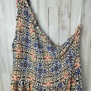 Knox Rose One Shoulder Geometric Flowy Tiered Maxi Dress Tan and Blue.