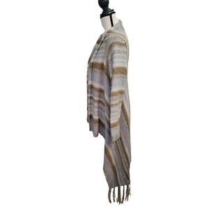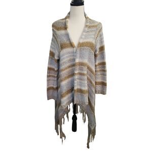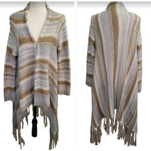 Knox Rose Open Front Cardigan Sweater Duster Fringe Knit Tan Striped Sz L, Hi Low