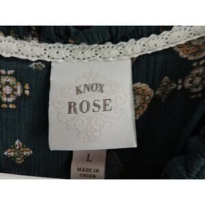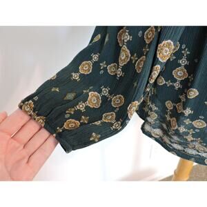 Knox Rose Prairie Style Blouse in dark green with Embroidery design on the front yoke, tie at neck with beaded tassels. It has gathered cuffs and long sleeves.