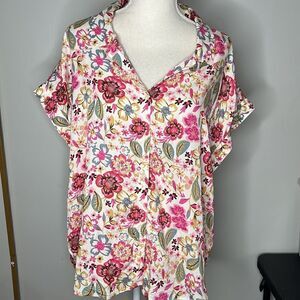 Elegant purple blouse with floral pattern. Features button-up front and flowy design. Ideal for versatile styling.