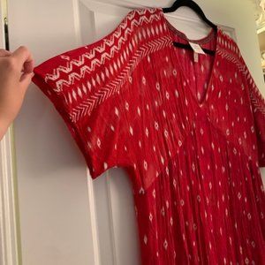 Knox Rose brand bought from Target. Love this dress, length is between midi and maxi. Light, quick drying material. Great as a swim coverup or on a summer night. The silhouette is super flattering and the print isn't too loud. Perfect, watercolor-like red.