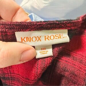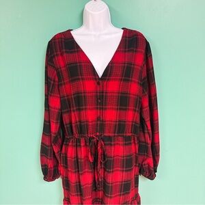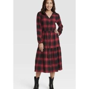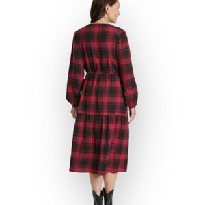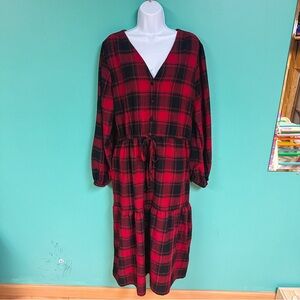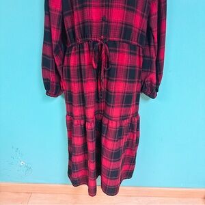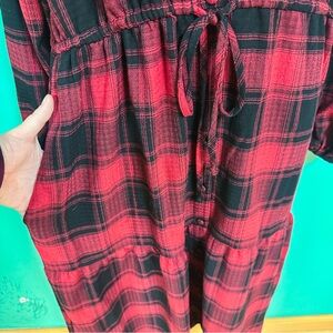 Women’s red & black buffalo plaid tiered boho a-line midi dress from Knox Rose with front pockets and v-neckline - excellent used condition