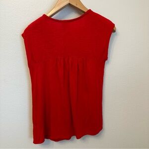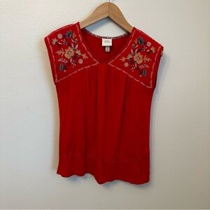 Charming red blouse with floral embroidery. Sleeveless design. Perfect for casual or dressy occasions.