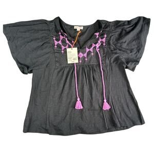 Knox Rose Shirt Women Medium Black Boho Cottagecore Short Sleeve Embroidered NWT
