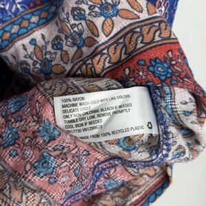 Color/Pattern: Blue base with red and white floral print; coordinating border print at neckline and hem; decorative stitched trim detail.