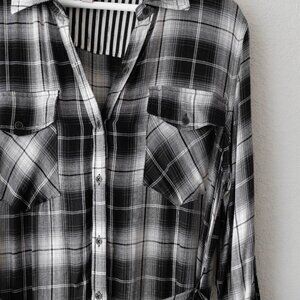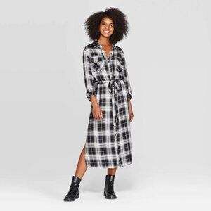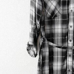 Add timeless style and effortless comfort to your wardrobe with this Knox Rose Size Medium Plaid Midi Shirt Dress. Designed in a classic black-and-white plaid, this versatile piece features a button-front closure, collared neckline, and two chest pockets for a casual yet polished look. The self-tie belt cinches the waist for a flattering silhouette, while the long roll-tab sleeves let you adjust from laid-back to more refined styling.