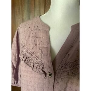 Lavender colored short-sleeve, button front blouse. It is 100% cotton and in a size small. Bodice is an eyelet fabric. V-neckline.