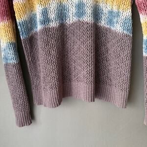 This is a pre-owned Knox Rose sweater, size medium. It features a brown, open-knit design with a horizontal tie-dye pattern across the chest and arms in red, yellow, and blue. The sweater has a round neckline and long sleeves with ribbed cuffs and hem. The material is 100% cotton. There are no visible stains or tears.