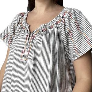 the cutest white and grey stripped shift dress! also has colorful fun detail at the top! brand is Knox Rose. size is XXL on tag, i wear a size small and this is how it fits! love a loose, oversized look! also has pockets on both sides