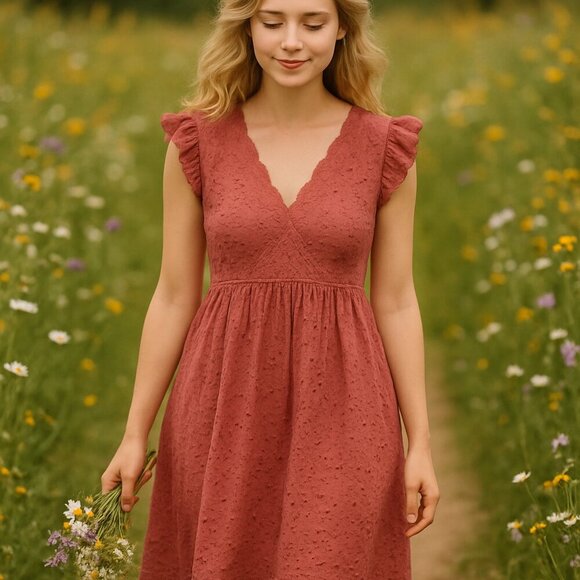 The Knox Rose Women's Large Dark Mauve Eyelet Lined Dress is a charming A-line silhouette featuring ruffle accents and a V-neckline. Made of cotton with a classic eyelet design, this knee-length dress is perfect for casual occasions and travel. The solid dark berry pink color and scalloped hem give it a cottagecore romantic feel, while its flutter sleeves and empire waist add elegance. Machine washable for easy care, this dress is a stylish choice for the seasons of summer, fall, and spring.