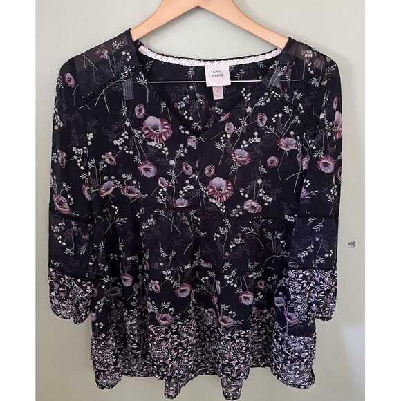 Knox Rose Women's Top Blouse Sheer Black Floral Pattern Size Small