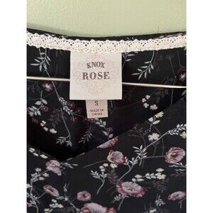 Up for sale is this Knox Rose Women's Top Blouse Sheer Black Floral Pattern Size Small. 100% polyester. Elastic on the cuffs.