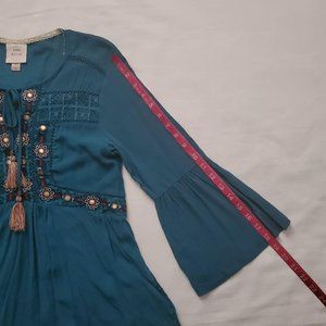 Knox Rose Womens XS Boho Top Lg Bell Sleeve Embroidered W/ Tassels Blue Green