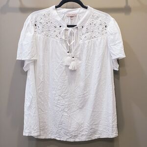 Knox Rose Woven Eyelet V Neck Short Sleeve Top Sz XXL White Tassels Cot…