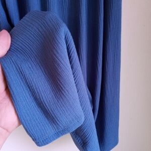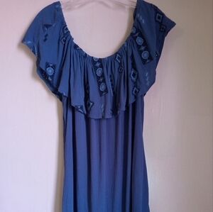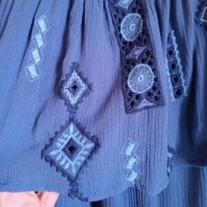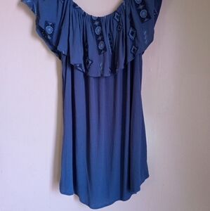 Beautiful blue embroidered ruffled off the shoulder A-line top by Knox Rose. In excellent condition, no flaws. Crepe fabric that is flowy breezy and easy to maintain because it's not easily wrinkled and is machine washable. Gorgeous embroidered detail, flattering to the figure, cool to the touch. Perfect summer top to keep you cool and looking gorgeous! Pairs well with jeans, skirt, or capris.